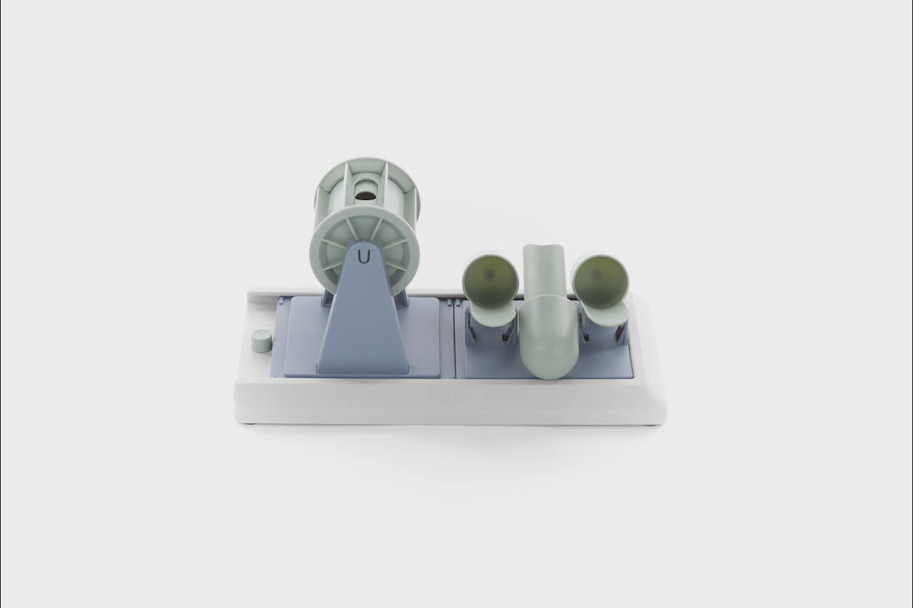 Brettspiel mit Wipp- und Drehelement in der neuen Farbe "salbei/blau".