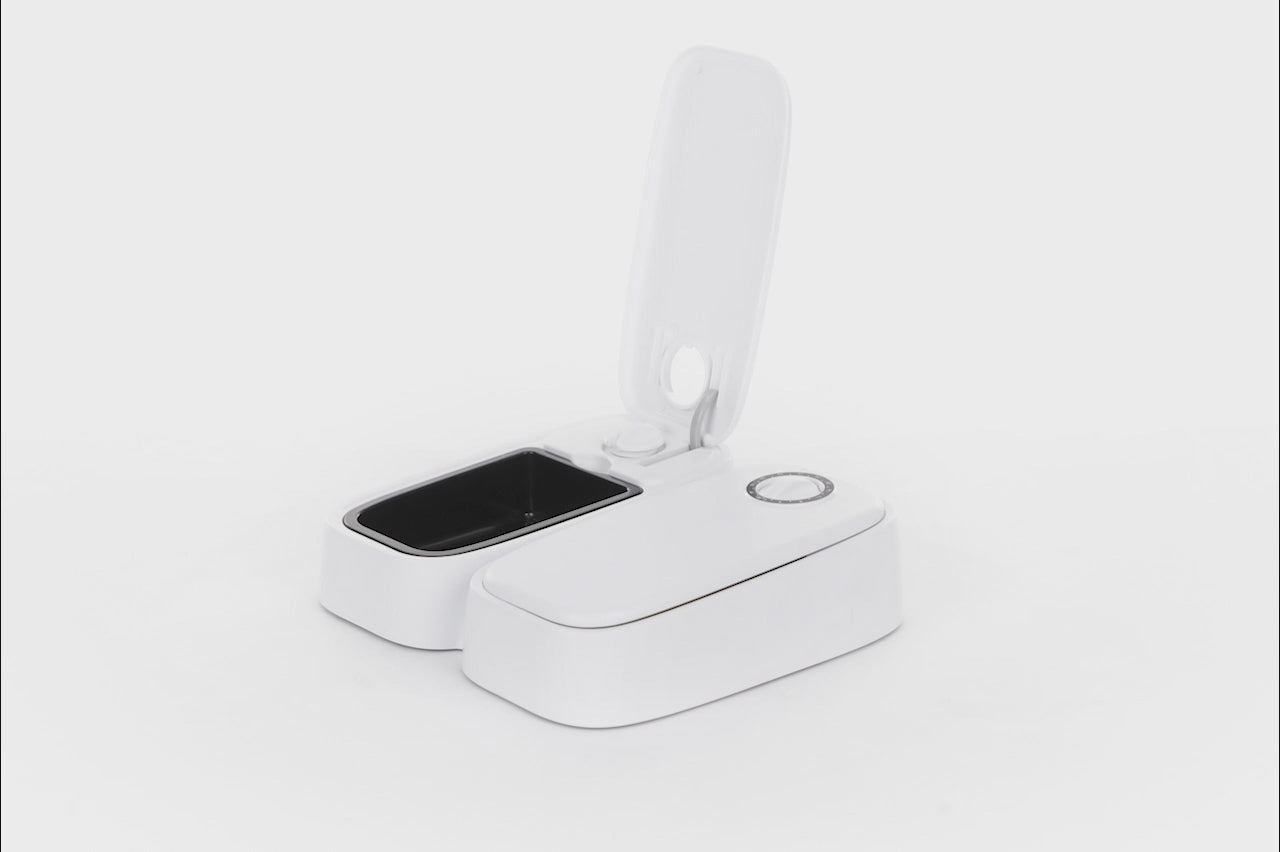 Schaltuhr gewährleistet ein automatisches Öffnen des Napfes nach Ablauf der eingestellten Zeit für 2 Mahlzeiten.