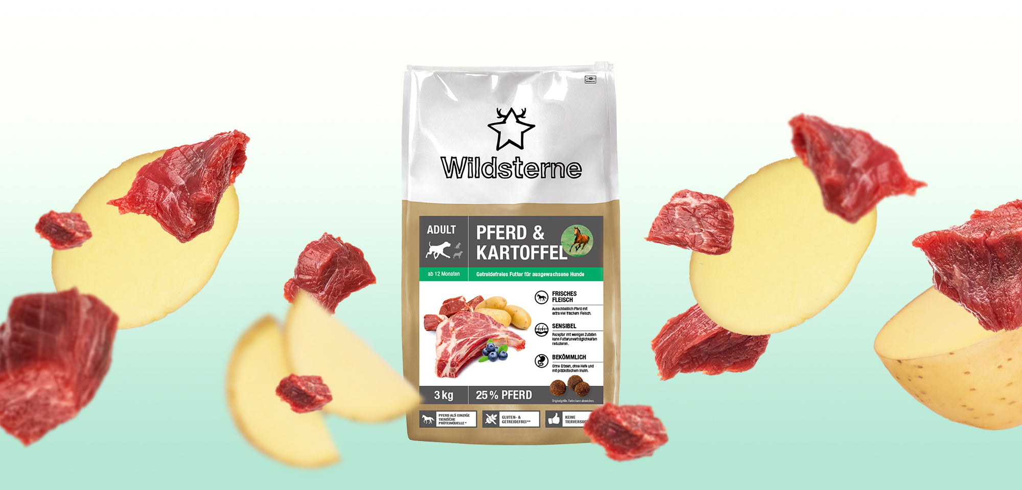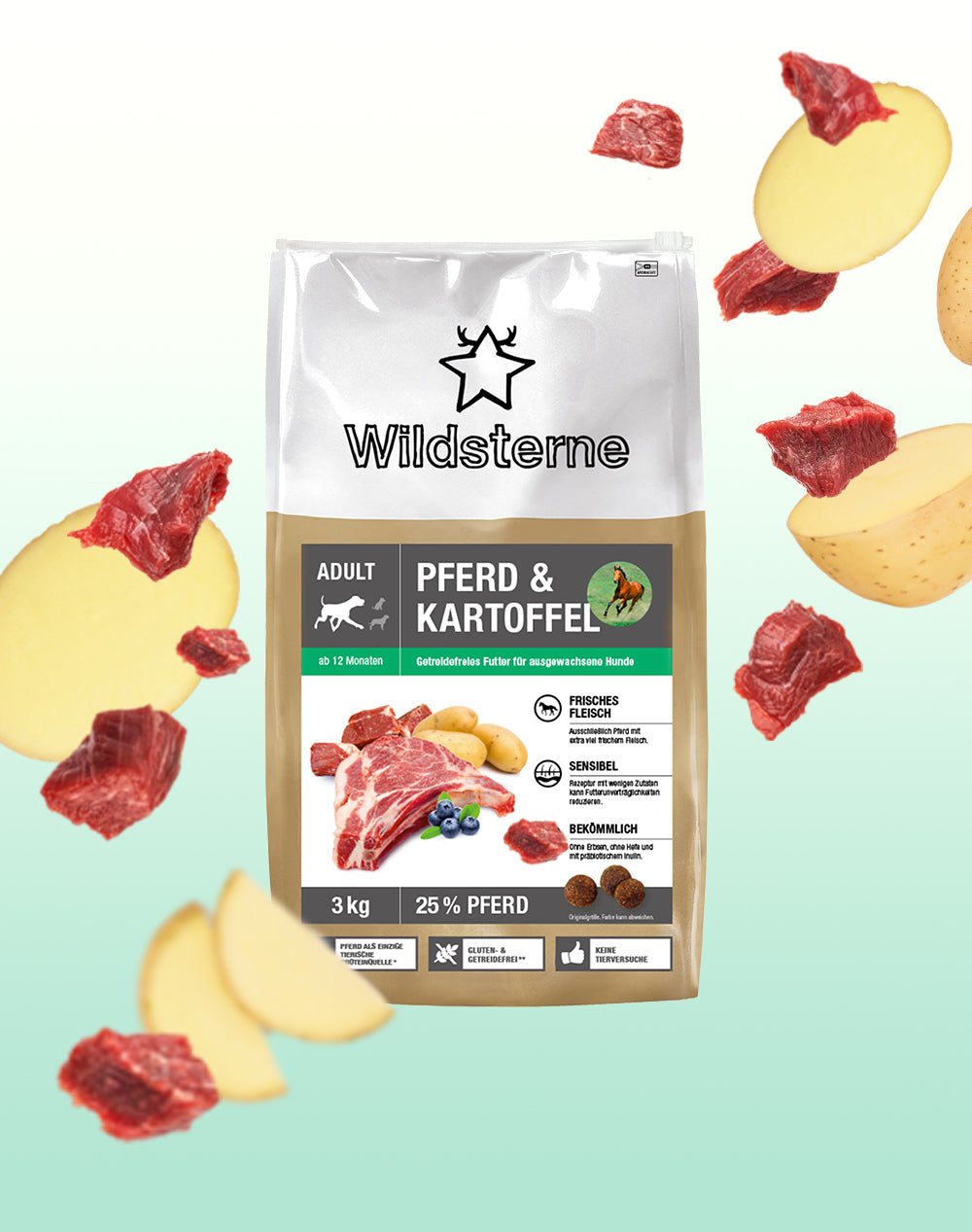 Die getreidefreie Rezeptur von Wildsterne Pferd & Kartoffel Adult ist speziell auf die Bedürfnisse von ausgewachsenen, ernährungssensiblen Hunden abgestimmt.